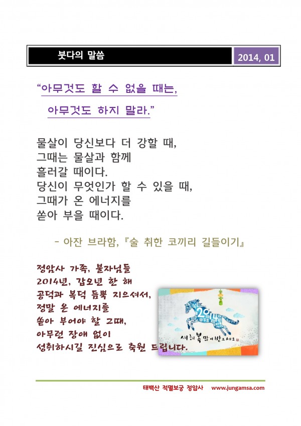 _()_ 붓다의 말씀 2014년 01월 - 아무것도 할수 없을때는... 페이지 정보 작성자 정암사 작성일14-01-01 16:44 조회11,251회 댓글0건 본문 ... 댓글목록 등록된 댓글이 없습니다. 이전글 다음글 목록