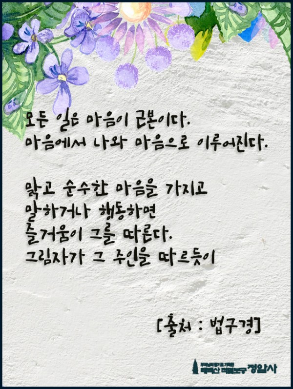 _()_ 붓다의 말씀 2023년 7월 - 모든 일은 마음이 근본이다 페이지 정보 작성자 정암사 작성일23-06-29 22:22 조회6,449회 댓글0건 본문 . 댓글목록 등록된 댓글이 없습니다. 이전글 다음글 목록