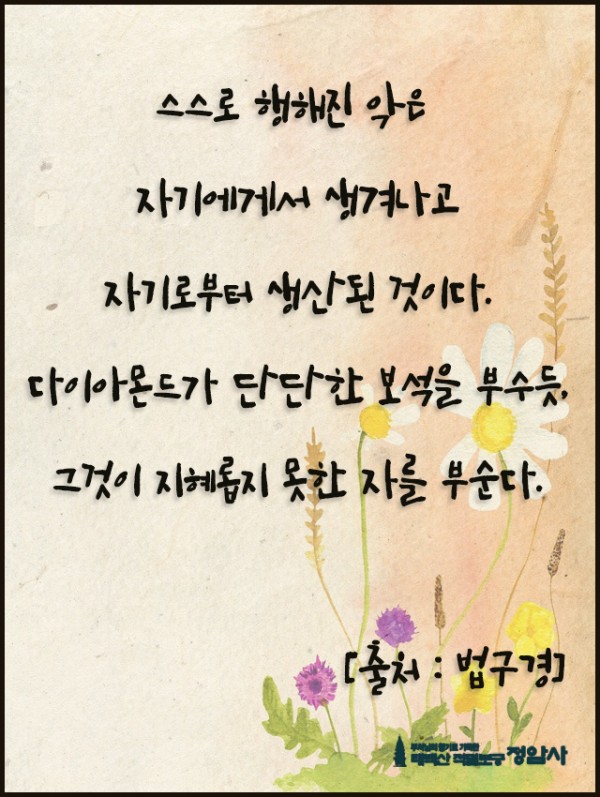 _()_ 붓다의 말씀 2023년 11월 - 스스로 행해진 악은 페이지 정보 작성자 정암사 작성일23-10-28 08:21 조회6,983회 댓글0건 본문 . 댓글목록 등록된 댓글이 없습니다. 이전글 다음글 목록