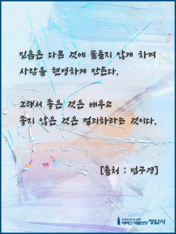 _()_ 붓다의 말씀 2022년 8월 - 믿음은 다른 것에 물들지 않게 하며 페이지 정보 작성자 정암사 작성일22-07-27 16:41 조회7,795회 댓글0건 본문 . 댓글목록 등록된 댓글이 없습니다. 이전글 다음글 목록