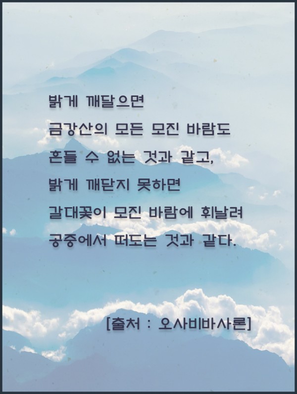 _()_ 붓다의 말씀 2019년 2월 - 밝게 깨달으면 금강산의 모진 바람도 페이지 정보 작성자 정암사 작성일19-01-29 15:22 조회9,907회 댓글0건 본문 댓글목록 등록된 댓글이 없습니다. 이전글 다음글 목록
