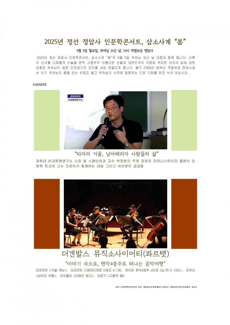 2025년 정선 정암사 인문학콘서트, 삼소사계 "봄" 페이지 정보 작성자 정암사 작성일25-04-29 18:31 조회4,630회 댓글0건 본문 . 댓글목록 등록된 댓글이 없습니다. 이전글 다음글 목록