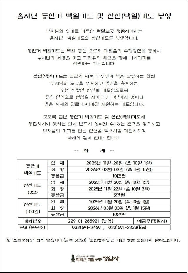 을사년 동안거 백일기도 및 산신(백일)기도 봉행 페이지 정보 작성자 정암사 작성일25-10-13 09:45 조회1,705회 댓글0건 본문 . 댓글목록 등록된 댓글이 없습니다. 이전글 다음글 목록