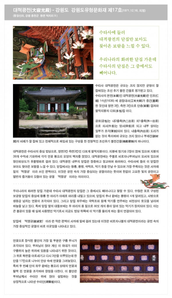 공작산 수타사 - 2 페이지 정보 작성자 정암사 작성일12-12-23 09:40 조회9,934회 댓글0건 본문 수타사 성보문화재http://t071.danah.kr/bbs/board.php?bo_table=02_1 댓글목록 등록된 댓글이 없습니다. 이전글 다음글 목록