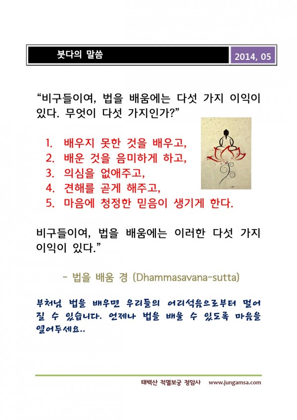 _()_ 붓다의 말씀 2014년 05월 - 법을 배우는 다섯 가지 이익 페이지 정보 작성자 정암사 작성일14-05-30 17:40 조회11,294회 댓글0건 본문 .. 댓글목록 등록된 댓글이 없습니다. 이전글 다음글 목록