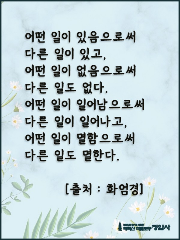_()_ 붓다의 말씀 2023년 6월 - 어떤 일이 있음으로써 다른 일이 있고 페이지 정보 작성자 정암사 작성일23-05-26 18:18 조회7,014회 댓글0건 본문 . 댓글목록 등록된 댓글이 없습니다. 이전글 다음글 목록