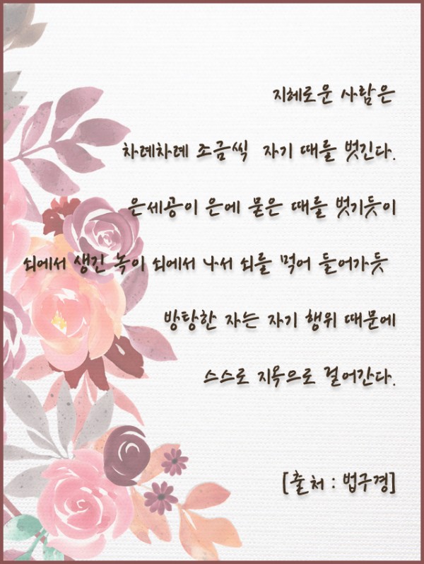 _()_ 붓다의 말씀 2019년 11월 - 지혜로운 사람은 차례차례 조금씩 페이지 정보 작성자 정암사 작성일19-10-29 16:57 조회10,307회 댓글0건 본문 댓글목록 등록된 댓글이 없습니다. 이전글 다음글 목록