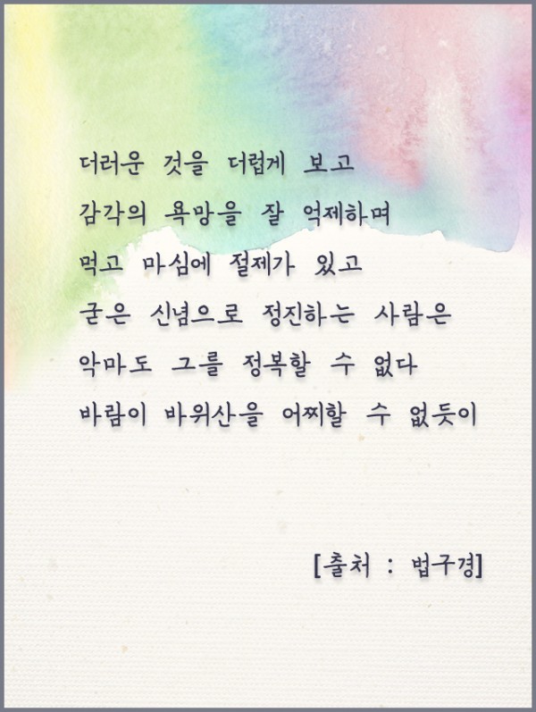 _()_ 붓다의 말씀 2019년 3월 - 더러운 것을 더럽게 보고 감각의 욕망을 잘 억제하며 페이지 정보 작성자 정암사 작성일19-02-26 13:50 조회10,372회 댓글0건 본문 댓글목록 등록된 댓글이 없습니다. 이전글 다음글 목록
