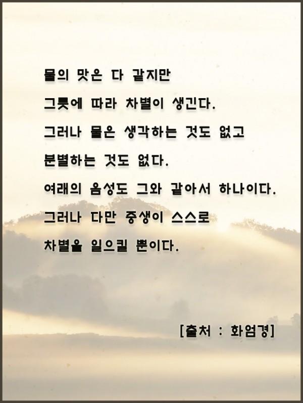 _()_ 붓다의 말씀 2018年 2月 - 물의 맛은 다 같지만 그릇에 따라 차별이 생긴다 페이지 정보 작성자 정암사 작성일18-01-30 13:42 조회10,895회 댓글0건 본문 댓글목록 등록된 댓글이 없습니다. 이전글 다음글 목록