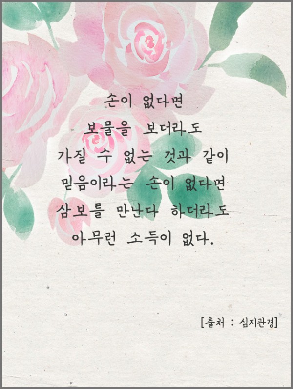 _()_ 붓다의 말씀 2021년 6월 - 손이 없다면 보물을 보더라도 가질 수 없는 것과 같이 페이지 정보 작성자 정암사 작성일21-05-27 11:55 조회10,067회 댓글0건 본문 . 댓글목록 등록된 댓글이 없습니다. 이전글 다음글 목록