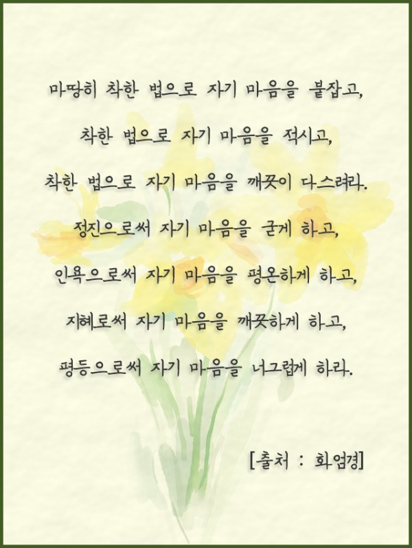 _()_ 붓다의 말씀 2022년 3월 - 마땅히 착한 법으로 자기 마음을 붙잡고 페이지 정보 작성자 정암사 작성일22-02-25 12:00 조회8,480회 댓글0건 본문 . 댓글목록 등록된 댓글이 없습니다. 이전글 다음글 목록