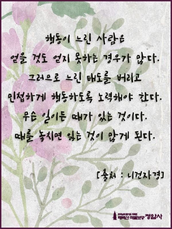 _()_ 붓다의 말씀 2024년 4월 - 행동이 느린 사람은 페이지 정보 작성자 정암사 작성일24-03-31 10:50 조회7,307회 댓글0건 본문 . 댓글목록 등록된 댓글이 없습니다. 이전글 다음글 목록