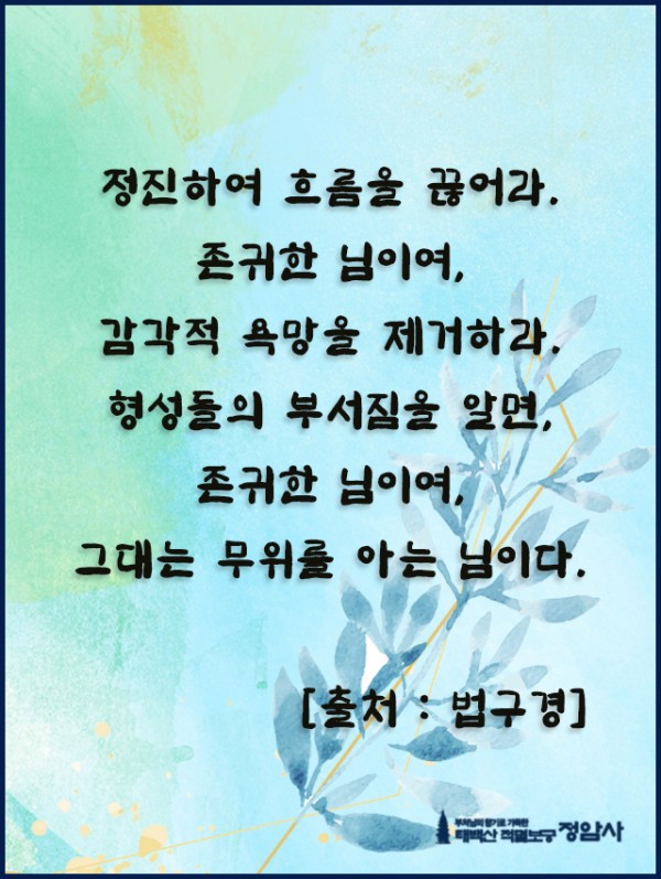 _()_ 붓다의 말씀 2024년 7월 - 정진하여 흐름을 끊어라 페이지 정보 작성자 정암사 작성일24-06-30 18:48 조회5,387회 댓글0건 본문 . 댓글목록 등록된 댓글이 없습니다. 이전글 다음글 목록