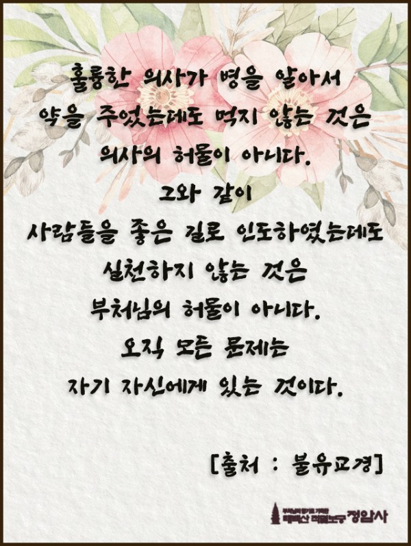 _()_ 붓다의 말씀 2024년 10월 - 훌륭한 의사가 병을 알아서 페이지 정보 작성자 정암사 작성일24-09-30 14:47 조회4,248회 댓글0건 본문 . 댓글목록 등록된 댓글이 없습니다. 이전글 다음글 목록