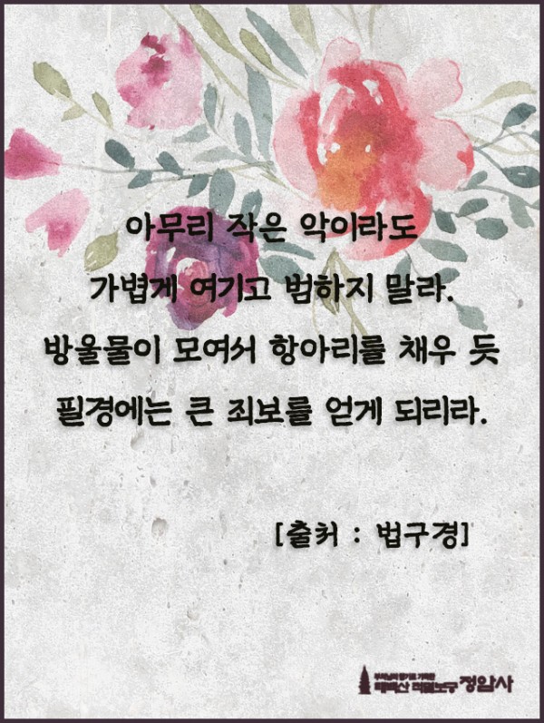 _()_ 붓다의 말씀 2024년 11월 - 아무리 작은 악이라도 가볍게 여기고 범하지 말라 페이지 정보 작성자 정암사 작성일24-10-30 13:32 조회4,041회 댓글0건 본문 . 댓글목록 등록된 댓글이 없습니다. 이전글 다음글 목록
