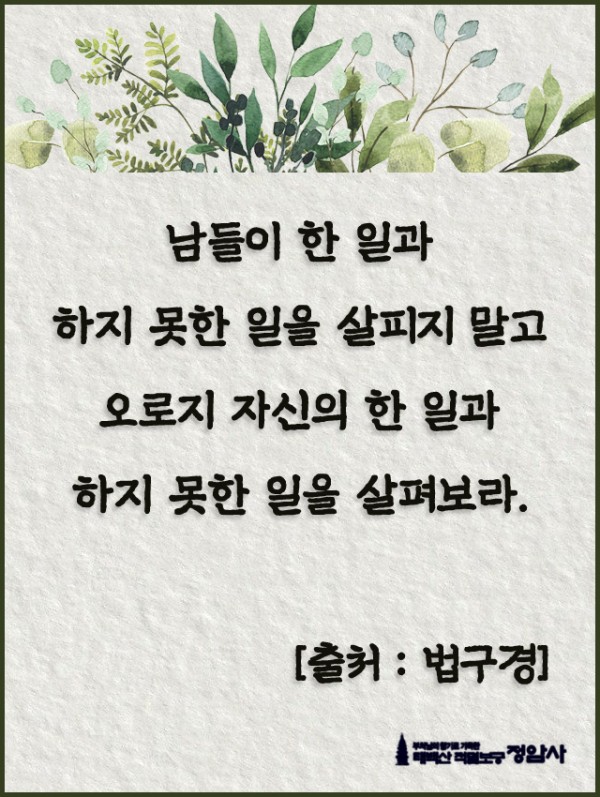 _()_ 붓다의 말씀 2025년 4월 - 남들이 한 일과 하지 못한 일을 살피지 말고 페이지 정보 작성자 정암사 작성일25-03-30 16:15 조회4,051회 댓글0건 본문 . 댓글목록 등록된 댓글이 없습니다. 이전글 다음글 목록