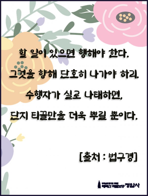 _()_ 붓다의 말씀 2025년 9월 - 할 일이 있으면 행해야한다 페이지 정보 작성자 정암사 작성일25-08-31 20:30 조회2,343회 댓글0건 본문 . 댓글목록 등록된 댓글이 없습니다. 이전글 다음글 목록
