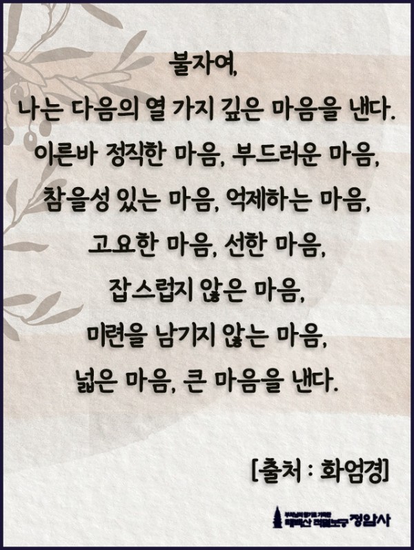 _()_ 붓다의 말씀 2025년 10월 - 불자여, 나는 다음의 열 가지 깊은 마음을 낸다 페이지 정보 작성자 정암사 작성일25-09-30 23:24 조회1,910회 댓글0건 본문 . 댓글목록 등록된 댓글이 없습니다. 이전글 다음글 목록