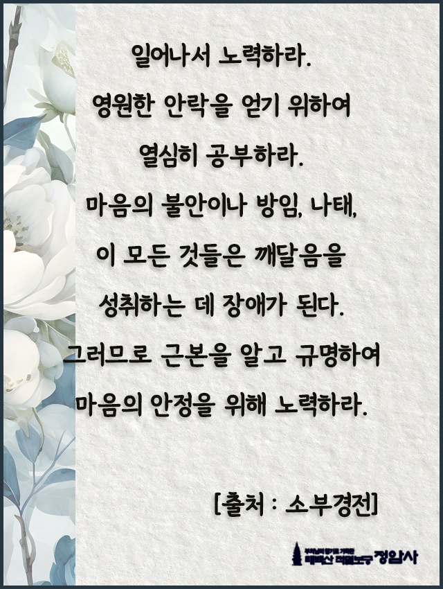 _()_ 붓다의 말씀 2026년 2월 - 일어나서 노력하라 페이지 정보 작성자 정암사 작성일26-02-01 21:58 조회157회 댓글0건 본문 . 댓글목록 등록된 댓글이 없습니다. 다음글 목록
