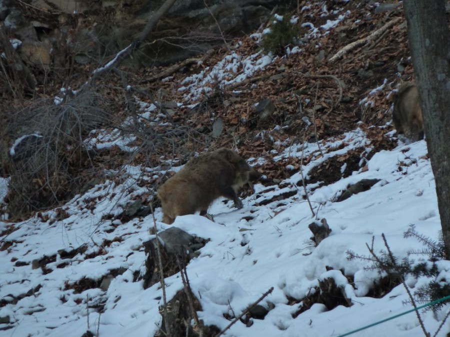 헌식대에 있던 음식물을 찾아 산에서 내려오는 멧돼지 한쌍..