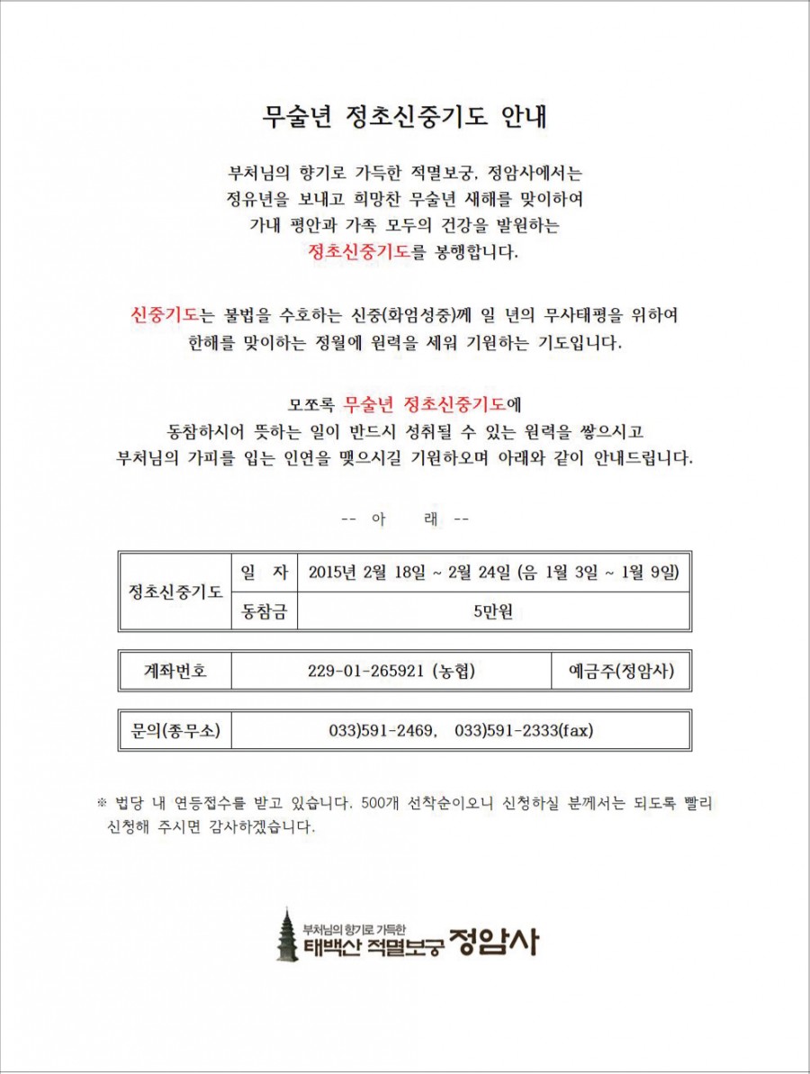 무술년 정초신중기도 봉행 페이지 정보 작성자 정암사 작성일18-01-05 12:21 조회9,501회 댓글0건 본문 * 클릭하시면 확대해서 보실 수 있습니다. 댓글목록 등록된 댓글이 없습니다. 이전글 다음글 목록