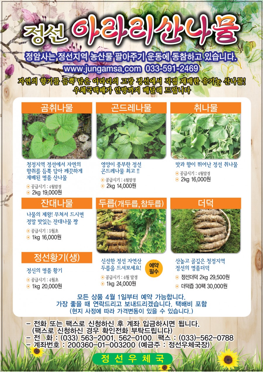 정선 아라리산나물 페이지 정보 작성자 최고관리자 작성일11-04-27 17:07 조회12,052회 댓글0건 본문 http://www.koreapost.go.kr/kw/233/ 댓글목록 등록된 댓글이 없습니다. 이전글 다음글 목록