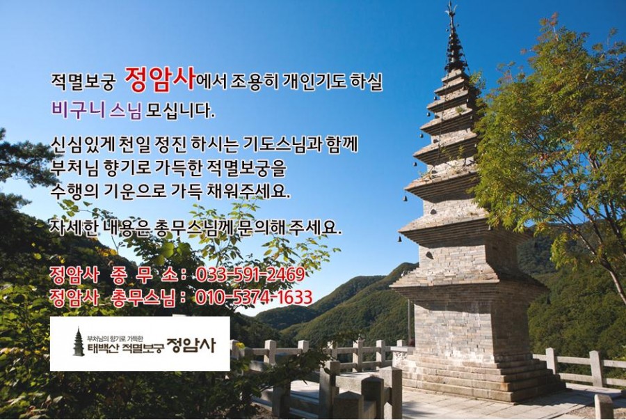 개인기도하실 비구니 스님 모십니다. 페이지 정보 작성자 정암사 작성일13-04-30 19:46 조회11,109회 댓글0건 본문 ... 댓글목록 등록된 댓글이 없습니다. 이전글 다음글 목록