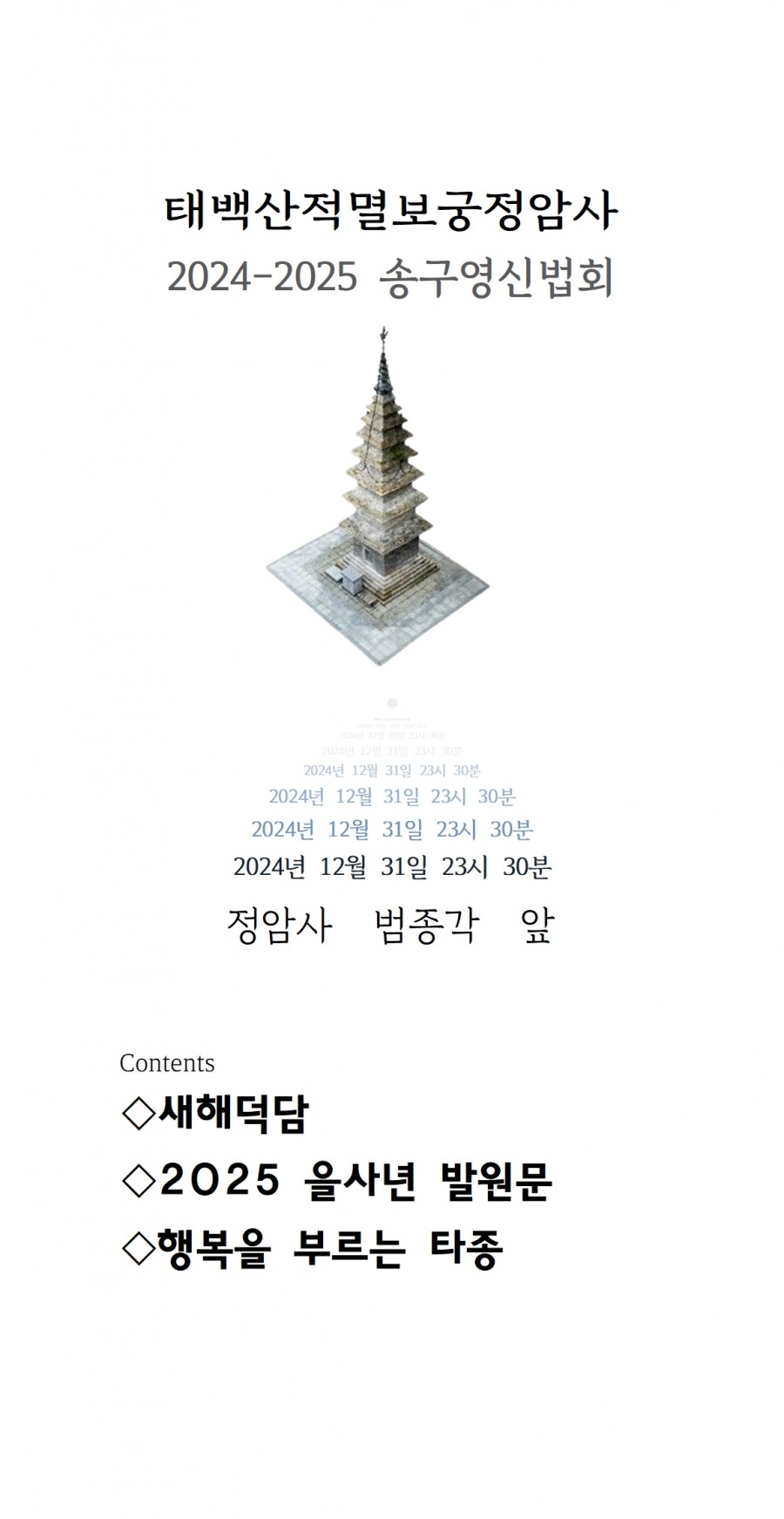 2024~2025 송구영신법회(24.12.31. 23:30) 페이지 정보 작성자 정암사 작성일24-12-29 09:59 조회4,227회 댓글0건 본문 . 댓글목록 등록된 댓글이 없습니다. 이전글 다음글 목록