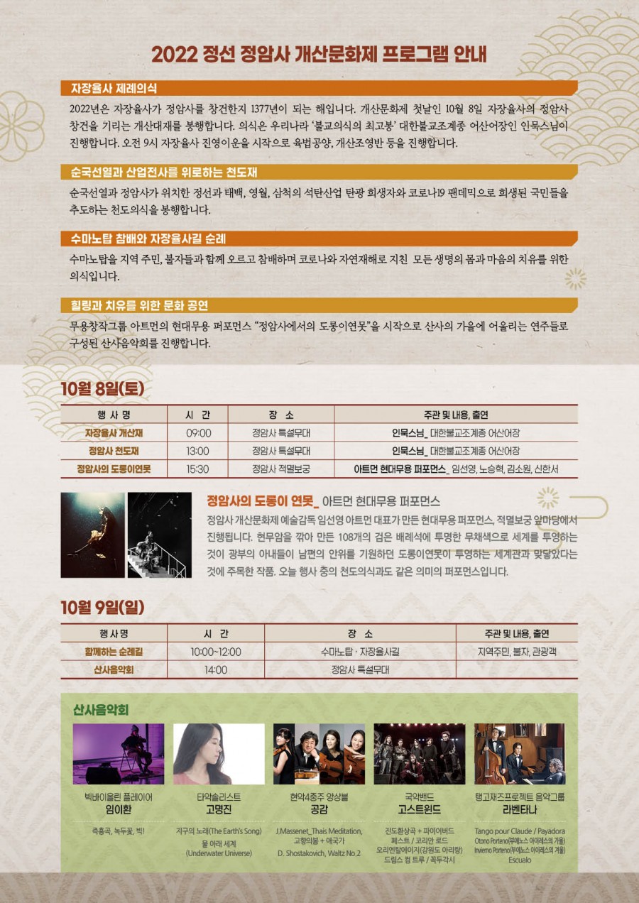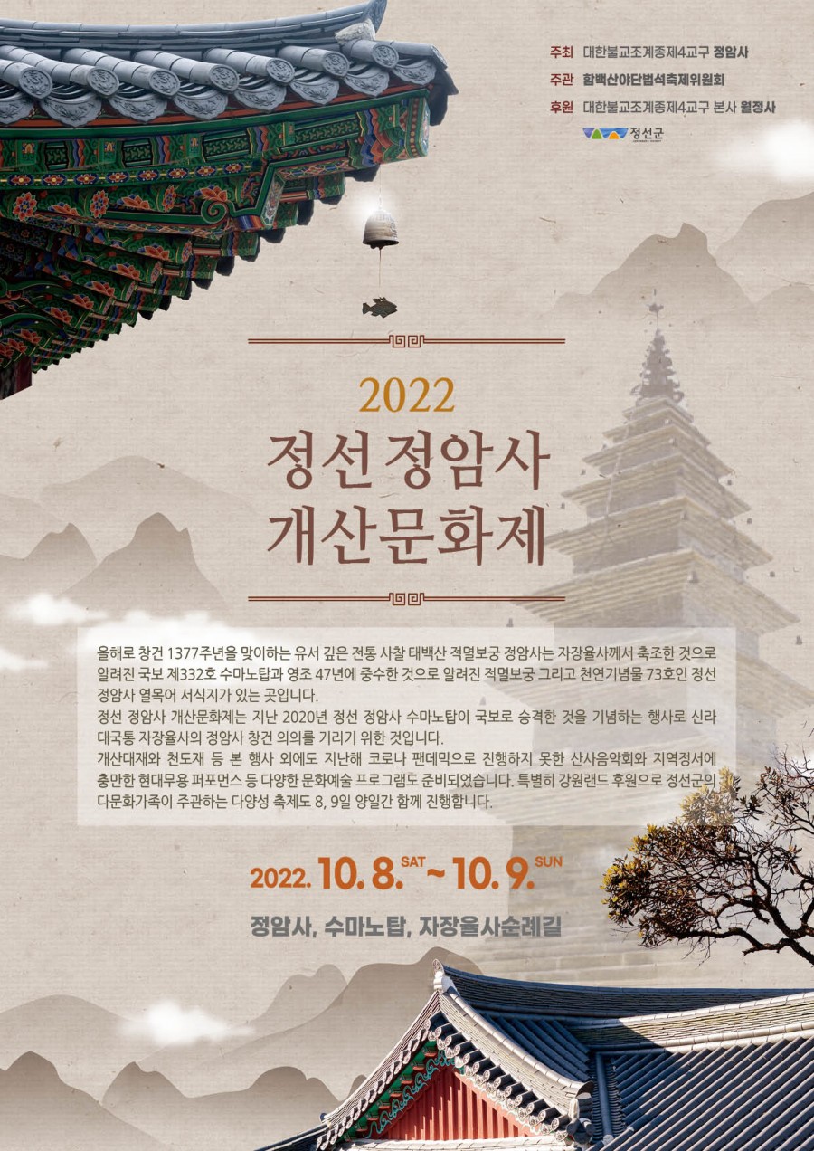 2022 정선 정암사 개산문화제_2022.10.8~10.9 페이지 정보 작성자 정암사 작성일22-09-16 09:55 조회6,500회 댓글0건 본문 . 댓글목록 등록된 댓글이 없습니다. 이전글 다음글 목록