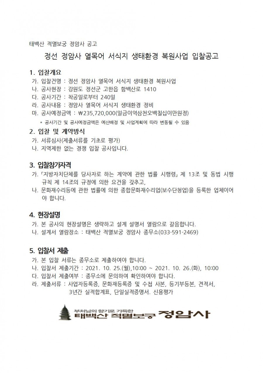 정선 정암사 열목어 서식지 생태환경 복원사업 입찰공고 페이지 정보 작성자 정암사 작성일21-10-18 17:24 조회8,194회 댓글0건 본문 정선 정암사 입찰공고 댓글목록 등록된 댓글이 없습니다. 이전글 다음글 목록