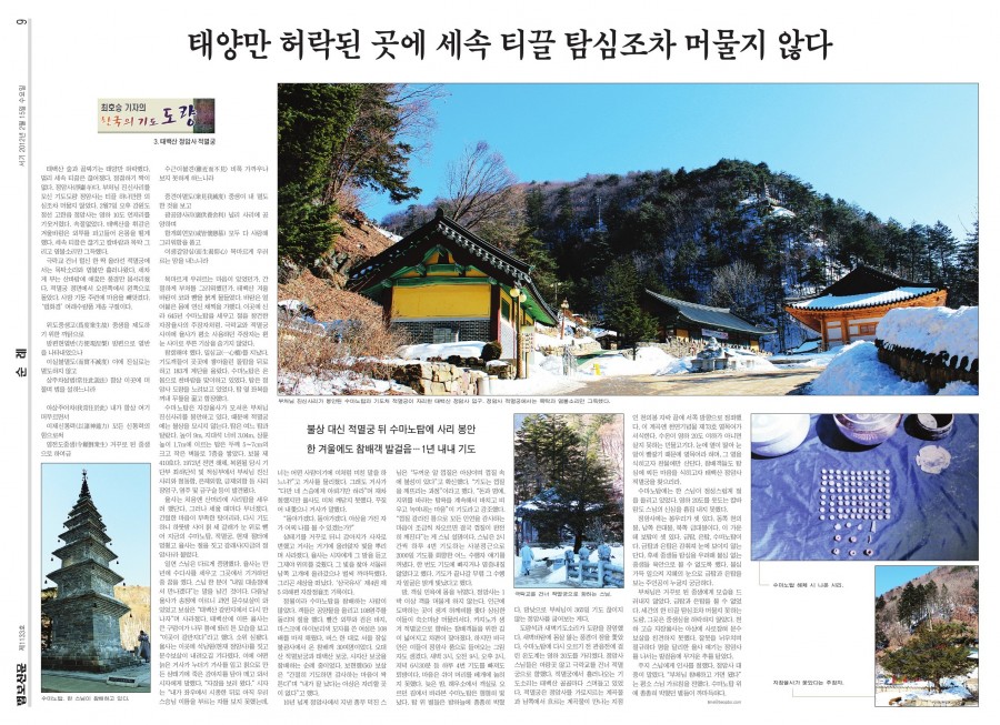 태백산 숲과 골짜기는 태양만 허락했다. 멀리 세속 티끌은 끊어졌다. 정결하기 짝이 없다. 정암사(淨巖寺)다. 부처님 진신사리를 모신 기도도량 정암사는 티끌 하나만큼 의심조차 머물지 않았다. 2월7일 오후 강원도 정선 고한읍 정암사는 영하 10도 언저리를 기웃거렸다. 속절없었다. 태백산을 휘감은 겨울바람은 외투를 파고들어 온몸을 떨게 했다. 세속 티끌은 끊기고 칼바람과 목탁 그리고 염불소리만 그득했다.